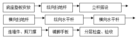 3)扫地杆:纵向扫地杆采用直角扣件固定在距离底座200mm处的立杆上;横向扫地杆固定在紧靠纵向扫地杆下方的立杆上。